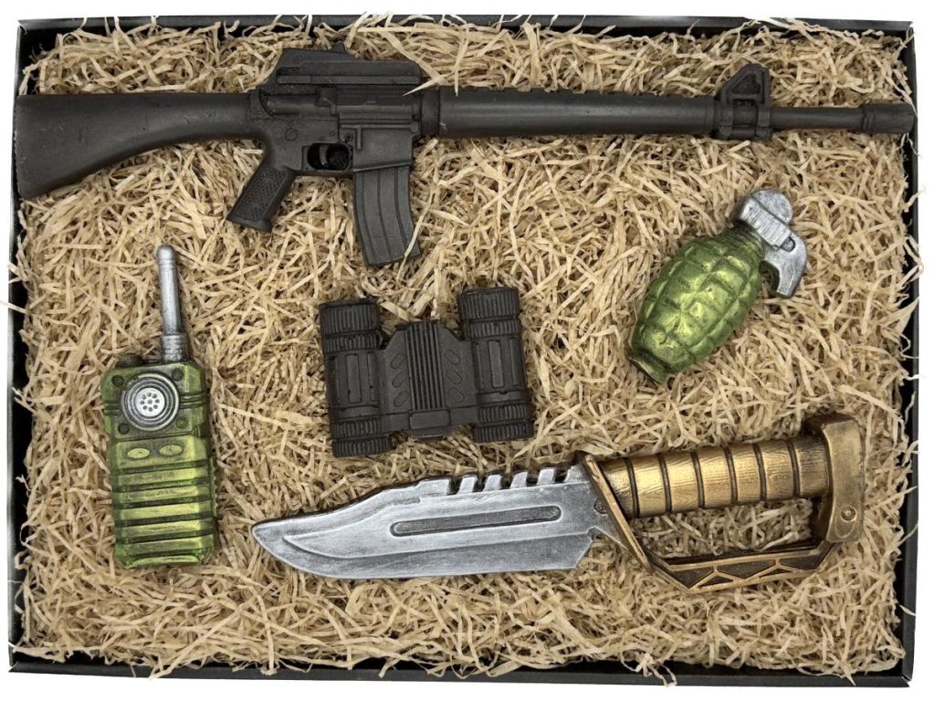 Čokoládový samopal, granát, nůž, dalekohled, vysílačka.