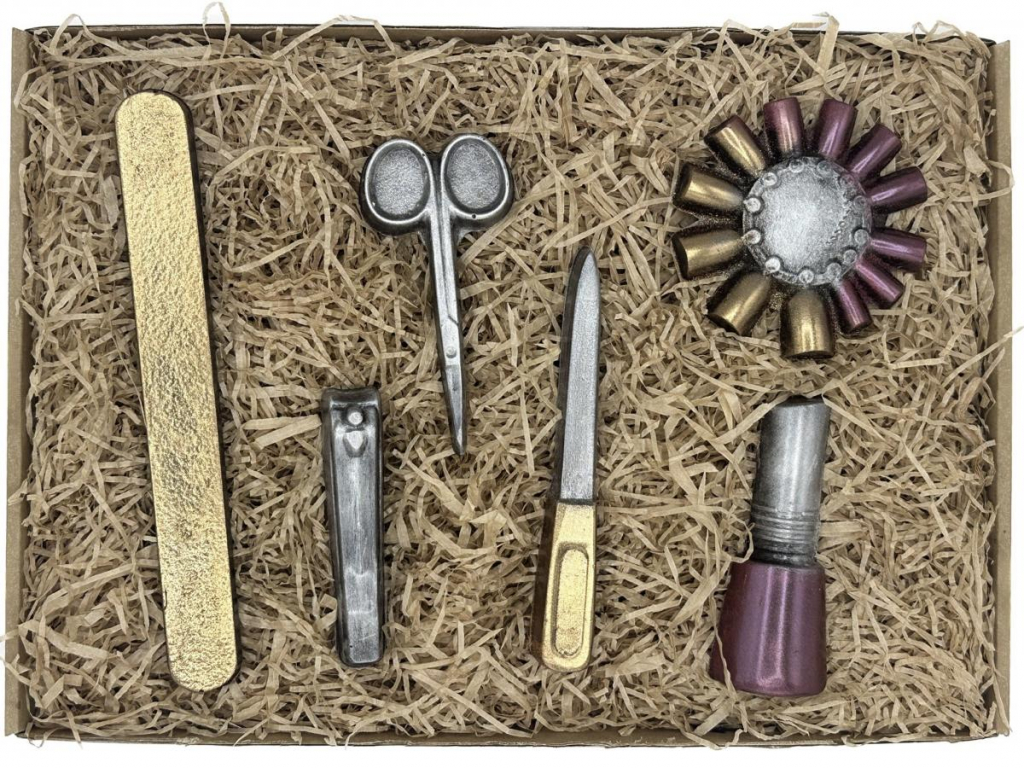 Čokoládový lak na nehty, 2x pilník, nůžky, vzorkovník, stříháček.