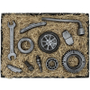 Čokoládový klíč na kola, šroub, ozubené kolečko, ložisko, 2x závaží a brzdová destička.